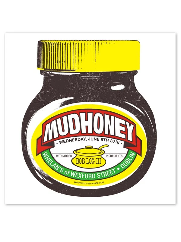 4 colour, 440 x 440mm / 17.25" x 17.25" screenprinted poster for Mudhoney at Whelan's, Dublin - June 8th, 2016. Yellow, red, green and Marmite brown ink on 250gsm Cocoon recycled card.