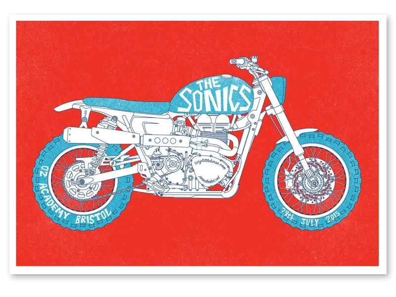 A2 (23" x 16") screenprinted poster for The Sonics at 02 Academy, Bristol, UK, July 29th, 2015. Red, blue and navy blue ink on 250gsm Cocoon recycled card.